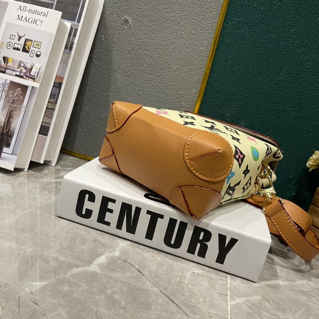 The handbag is from the brand’s collaboration series with Tyler. It presents a pocket-sized version of the Steamer handbag in Monogram Craggy canvas. The artist gives the Monogram pattern a hand-painted look. Cowhide leather shapes and reinforces the corner guards, shoulder strap, and flap.