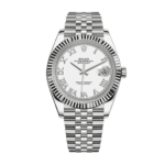 The Rolex Datejust 41mm Fluted White Roman Dial Jubilee 126334 Replica is a stunning watch. It features a 904L stainless steel case and bezel. with a white gold color and steel bezel color. The crystal is made of sapphire. and the size is 41.00mm. The bracelet is also made of 904L stainless steel. with an adjustable Jubilee type and steel color. The dial is white with Roman numerals as indices. and the hour markers are made of 904L stainless steel.