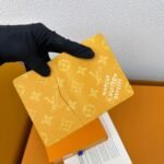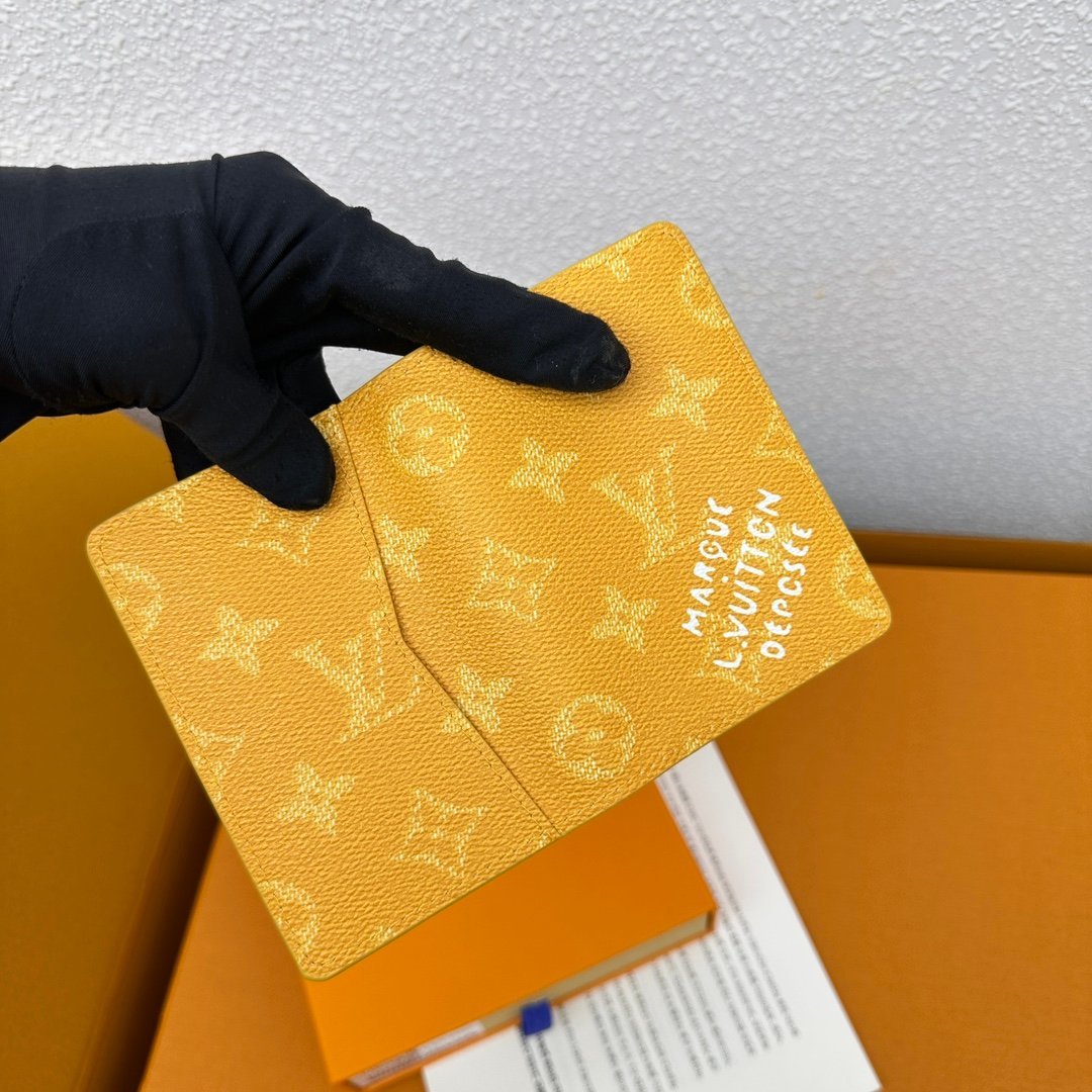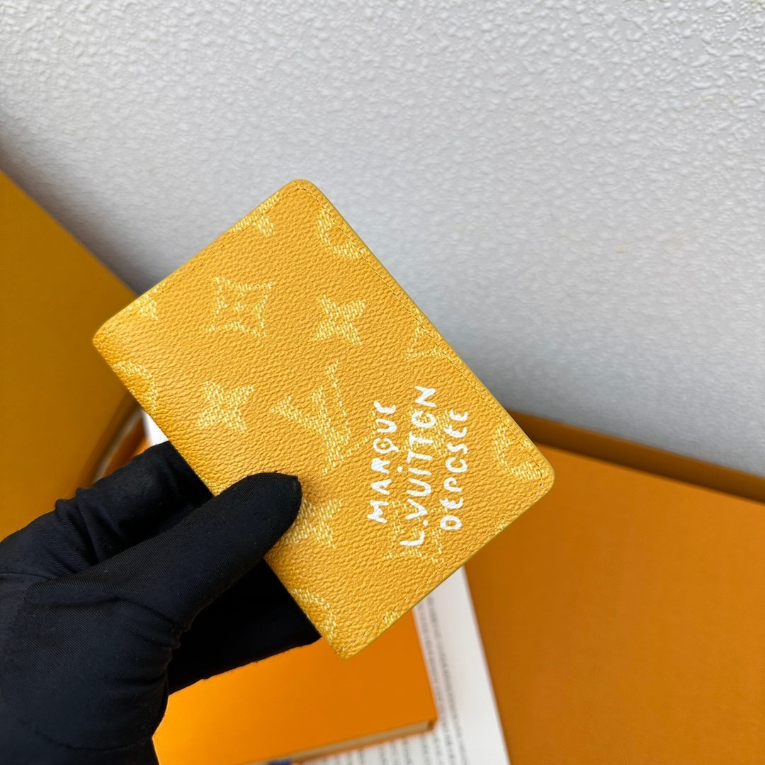 M12659 Yellow! Pocket wallet. This pocket wallet is made of Monogram Heritage coated canvas. It incorporates classic elements such as the vertical and horizontal textures of Damier check and the Marque L.Vuitton Déposée logo, showing Pharrell Williams’ modern interpretation of the Monogram pattern. 11.x 7.5